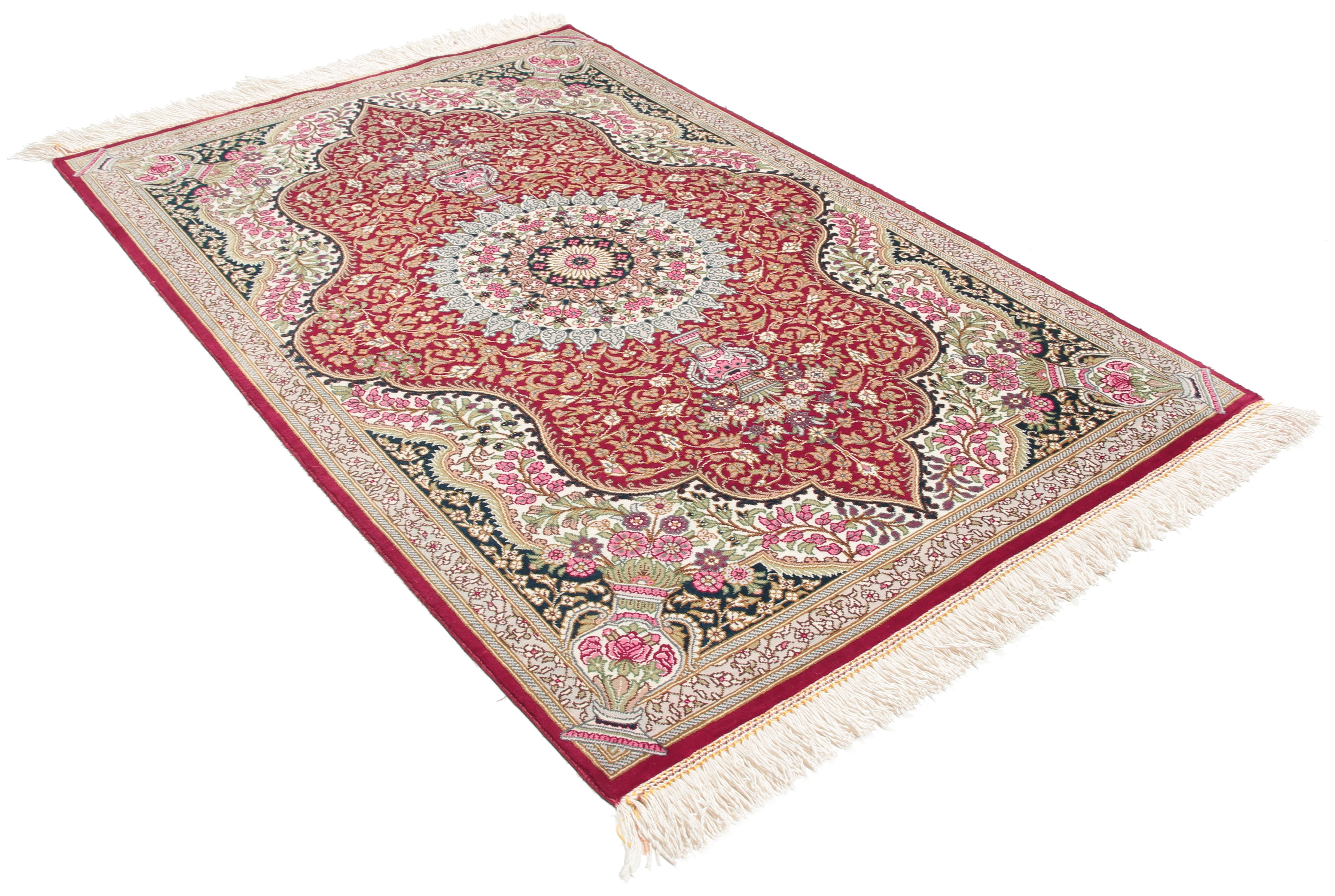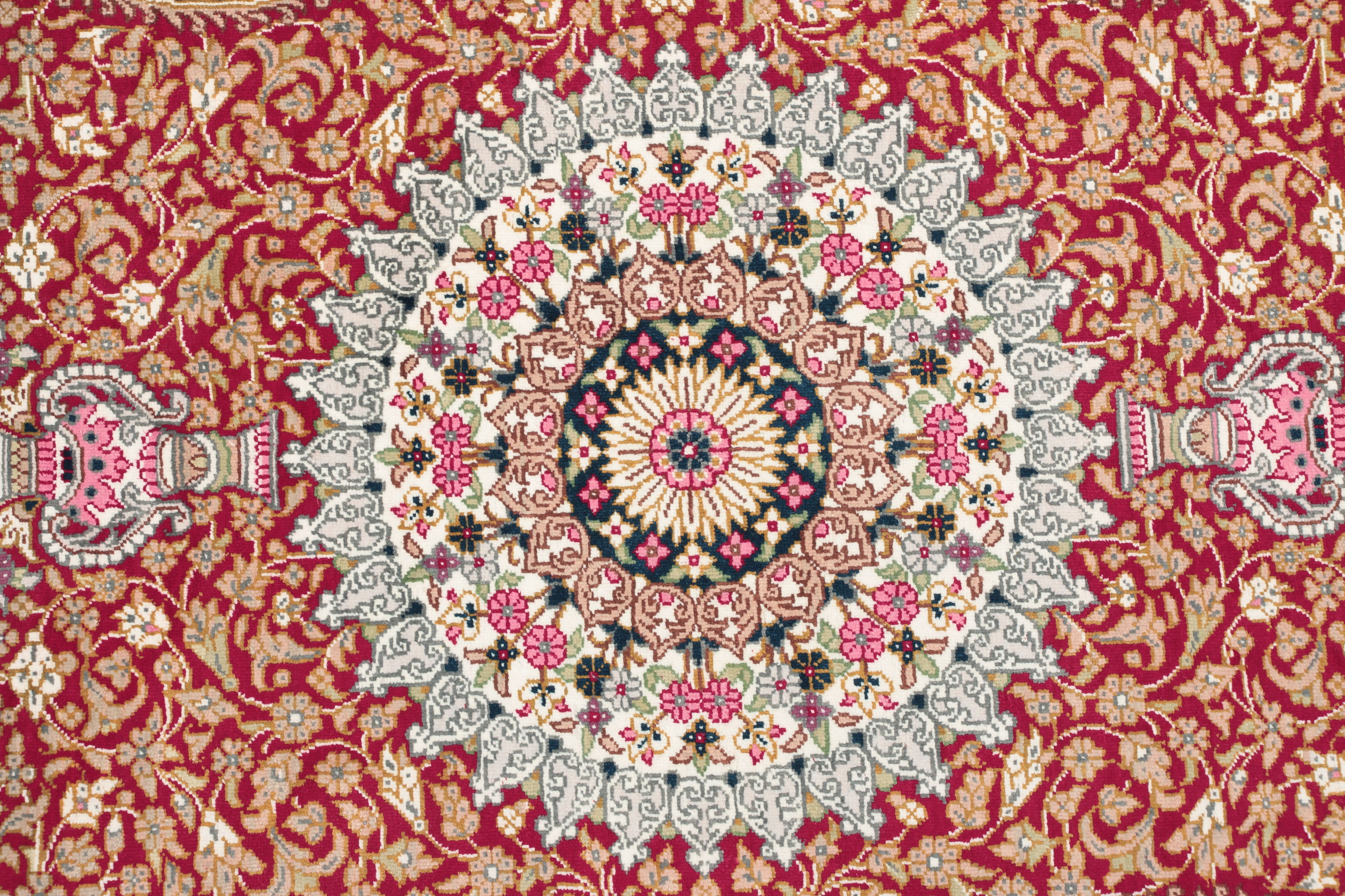 Flor aus Seide: Seide ist das feinste und geschmeidigste Garn der Welt und verleiht dem Teppich dadurch eine sehr exklusive Note. Seide wird nur für sehr hochwertige Teppiche verwendet und verleiht dem Teppich eine sehr angenehme Haptik.